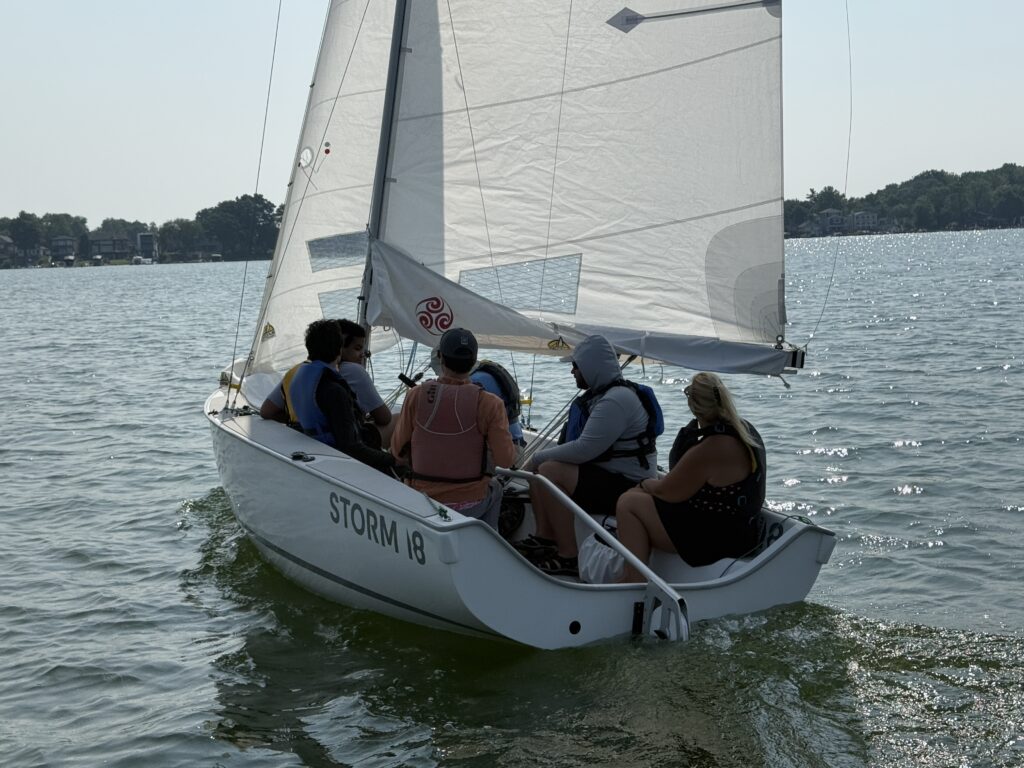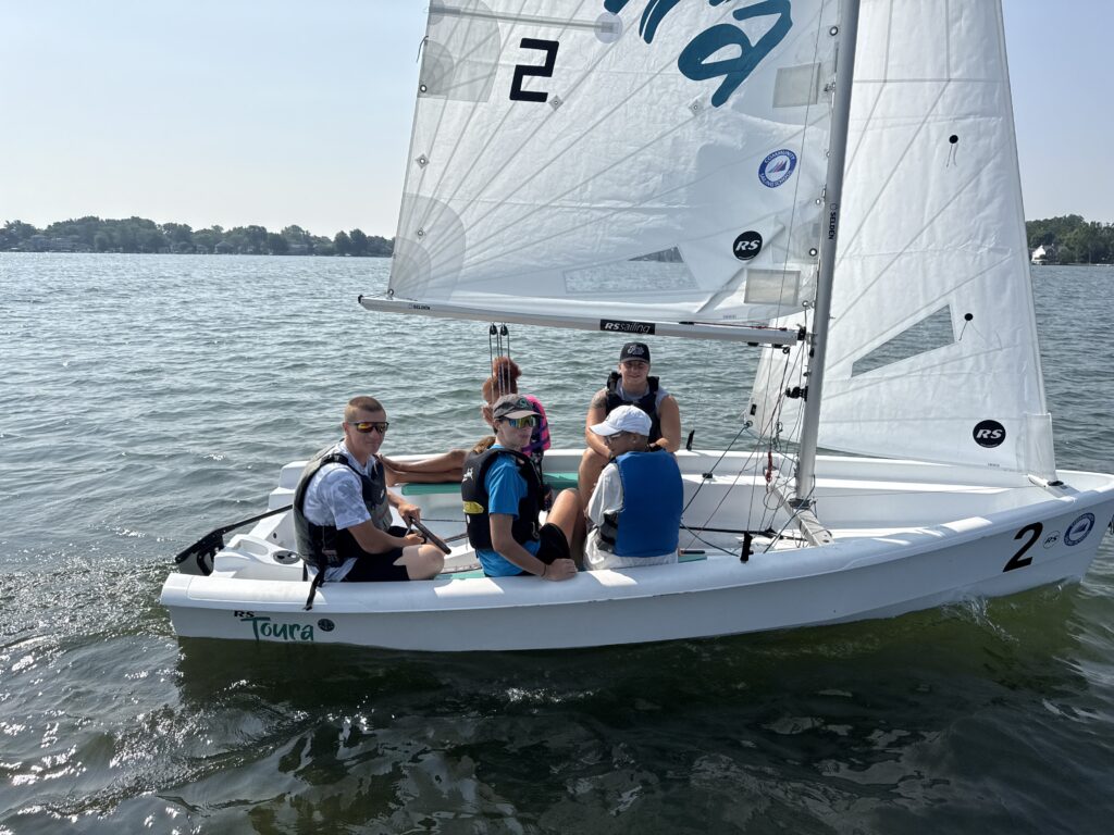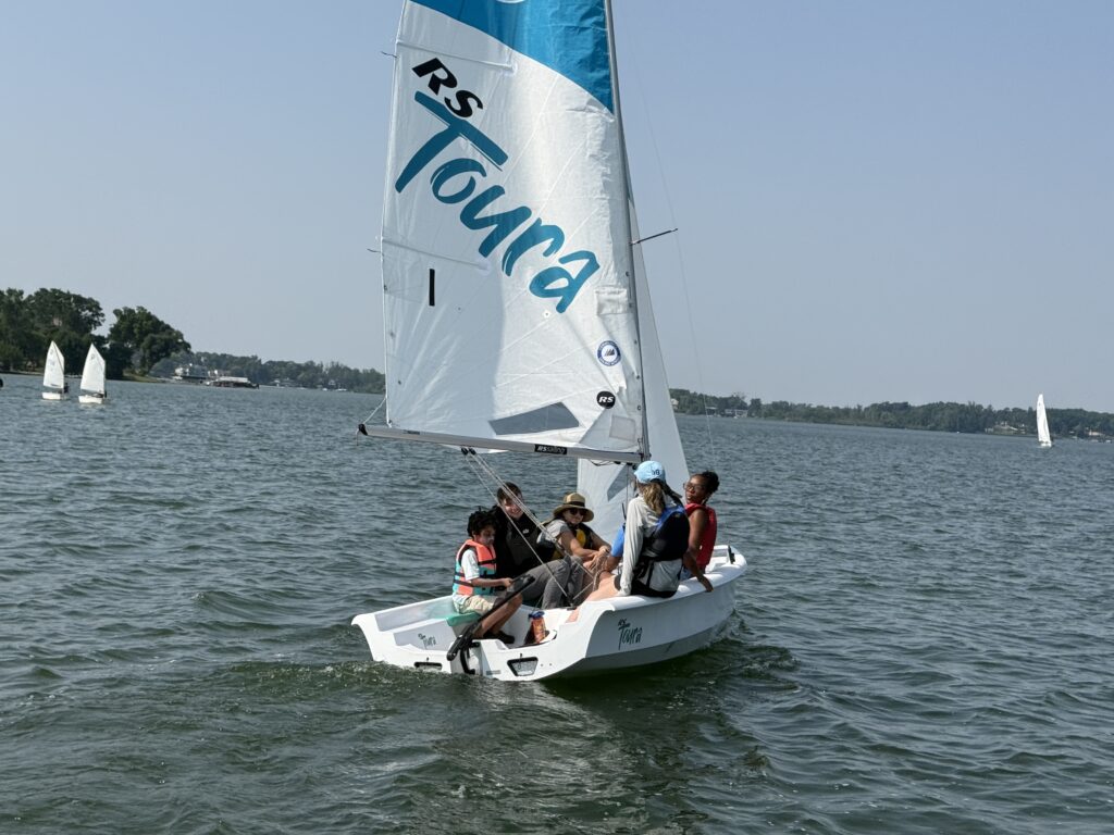This is a very exciting week! Community Sailing School is hosting a three day, six session, sailing adventure on Cass Lake. Thank you to Jim Allen for the use of his Storm 18 sailboat. Coach Brian Williams skipper for the Storm 18, along with RS Toura skipper Abby Allen and skipper Sean Ellison start out today on the water! Look at these great photos!